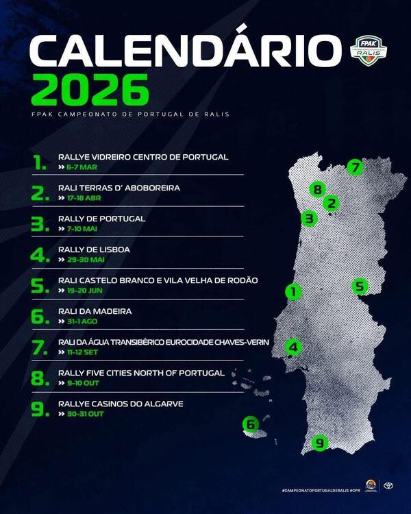 El calendario volverá a la tierra para el Rally Cinco Cidades Norte do Portugal, con el que Fafe volverá al calendario del ERC. De norte a sur, el calendario finalizará a finales de octubre con el Rally Casinos do Algarve.