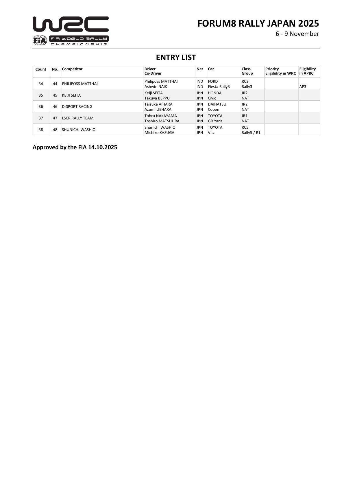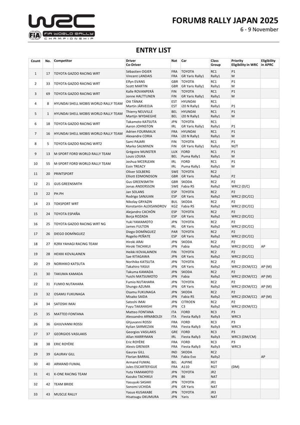 Este martes 14 de octubre se ha publicado la lista de inscritos del Rally de Japón, penúltima ronda del Campeonato Mundial de Rallies 2025. En ella aparecen 38 equipos participantes, con 2 pilotos y 3 copilotos españoles presentes para la prueba de casa de Toyota Gazoo Racing.