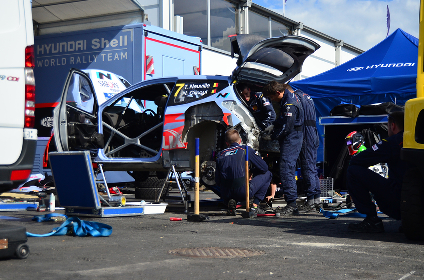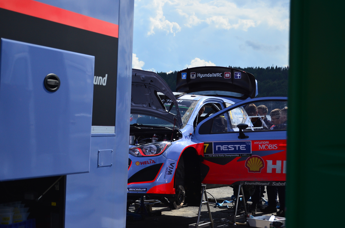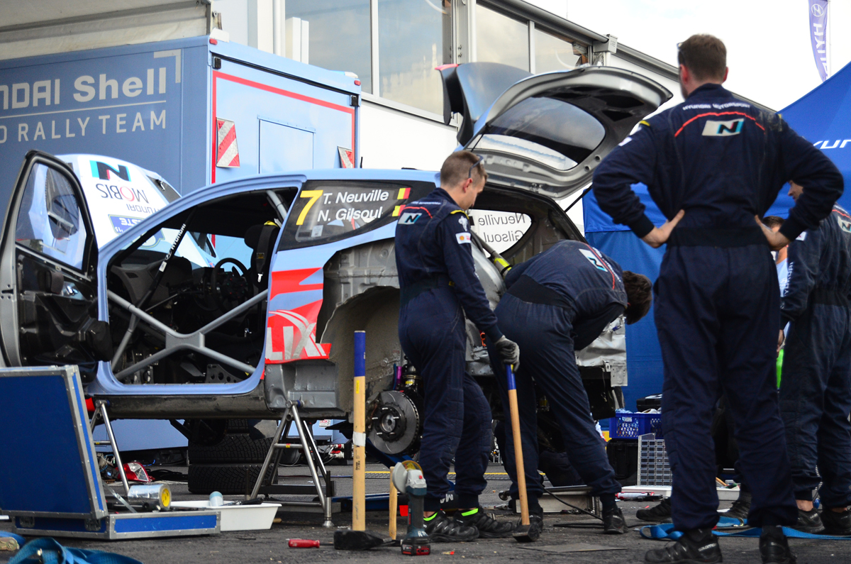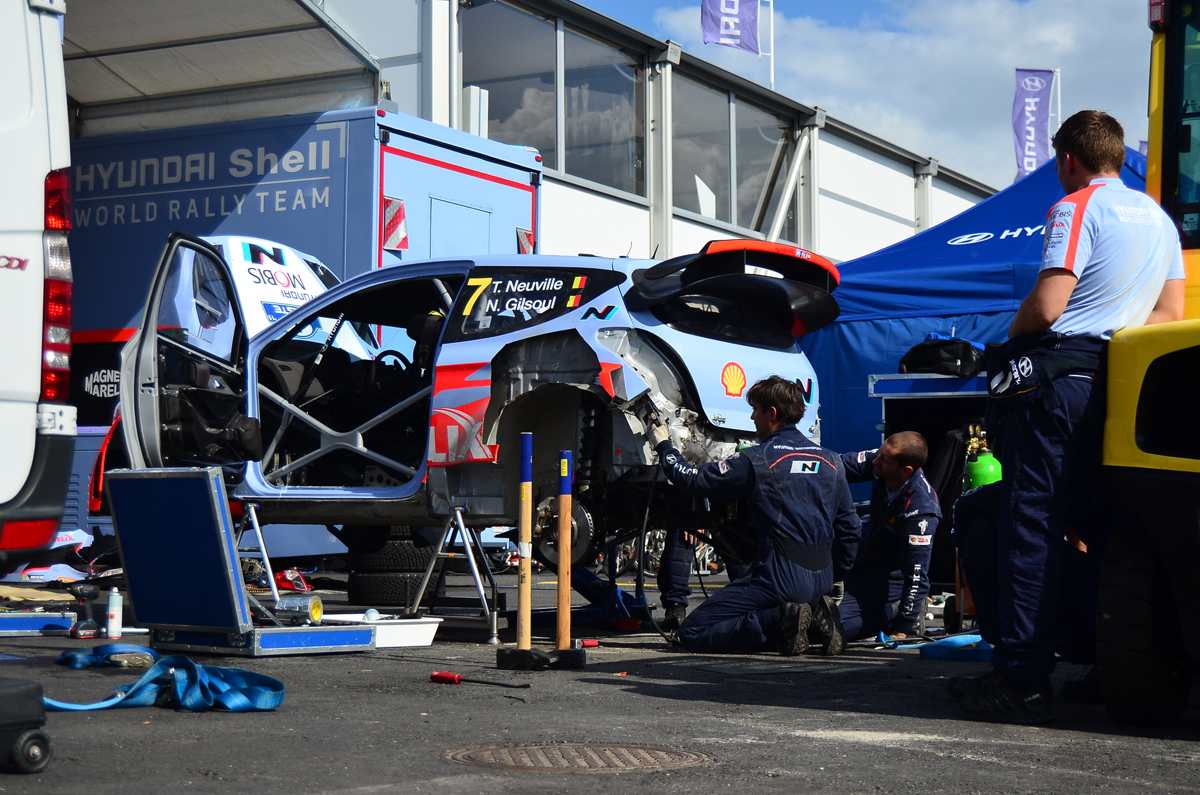 Tras el accidente que Thierry Neuville ha sufrido en el shakedown del Rallye de Finlandia, los mecánicos de Hyundai Motorsport tratan de arreglar el tren trasero del i20 WRC a tiempo para las verificaciones antes del primer tramo de la prueba. La prioridad es restaurar la jaula de seguridad, pues si no pasa el test de la FIA el belga no podría tomar la salida.